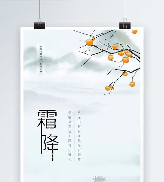 霜降二十四節(jié)氣之一,天氣漸冷,開始有霜。霜降一般是在每年公歷的10月23日,太陽到達黃經(jīng)210度時為二十四節(jié)氣中的霜降。霜降是秋季的最后一個節(jié)氣,是秋季到冬季的過渡節(jié)氣。秋晚地面上散熱很多,溫度驟然下降到0度以下,空氣中的水蒸氣在地面或植物上直接凝結(jié)形成細微的冰針,有的成為六角形的霜花,色白且結(jié)構(gòu)疏松。
